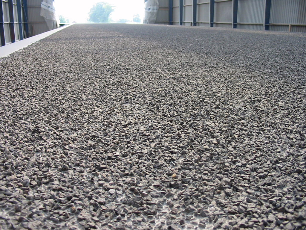 Gulvbelægningen indeholder en stor andel af bindemiddel, der er afgørende for belægningens styrke. Belægningen er bygget op på en måde, så kvartsmaterialet flyder homogent i hele belægningens tykkelse uden at synke til bunds. Dermed opnår man dels en 100% kontakt til betonunderlaget, dels en sejhård fleksibilitet, der gør, at belægningen kan optage tunge tryk og stød uden at belægningen bliver ødelagt og uden at betongulvet lider overlast. Oveni er belægningen reelt ikke til at slide op og tåler endda også meget hidsige kemikalier.