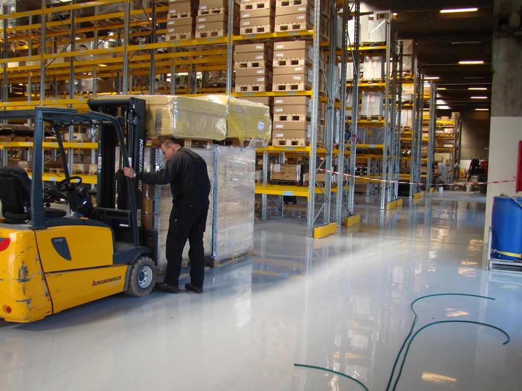 Den samlede belastning på gulvet – især i et højlager med pallereoler i op til seks etagers højde – krævede en gulvrenovering, der kunne sikre høj slidstyrke, rengøringsvenlighed og en lang levetid.