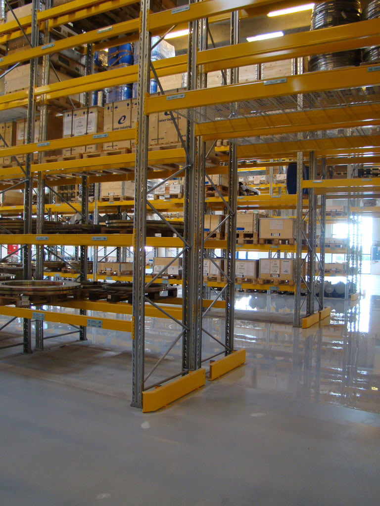 Den samlede belastning på gulvet – især i et højlager med pallereoler i op til seks etagers højde – krævede en gulvrenovering, der kunne sikre høj slidstyrke, rengøringsvenlighed og en lang levetid.