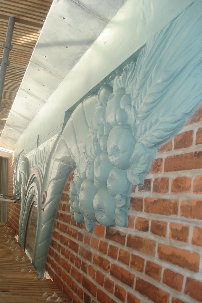Renoveringen omfattede både store flader som vinduesrammer og døre samt finere facadedekorationer i træ, der krævede omhyggelig håndværksmæssig behandling.