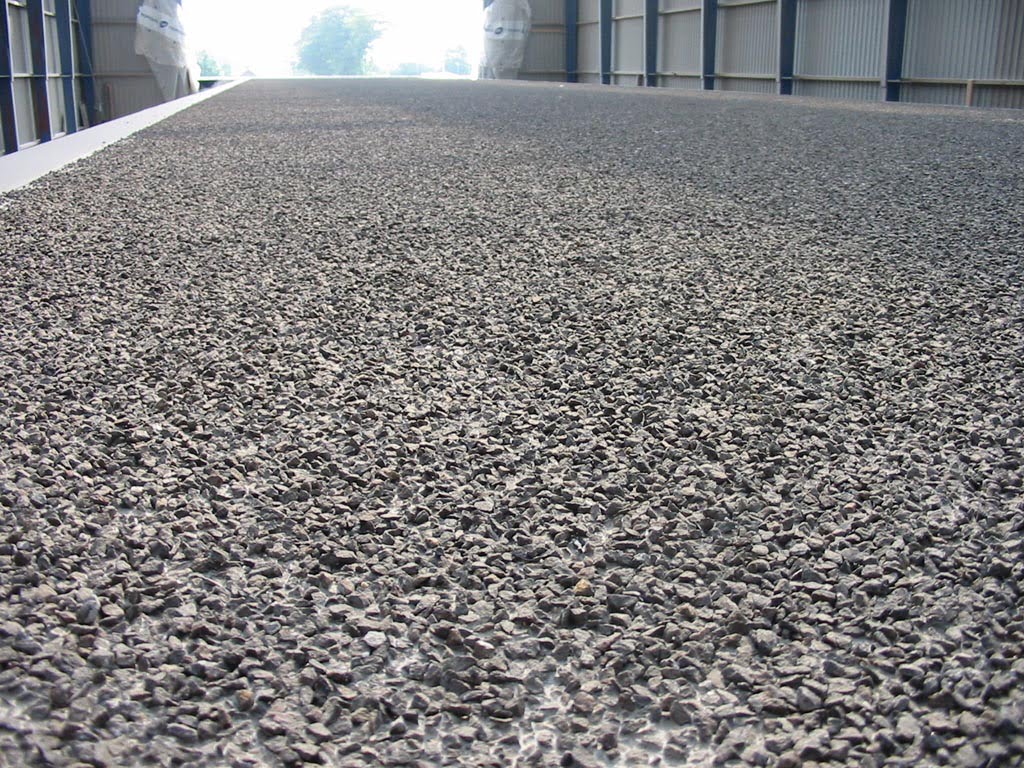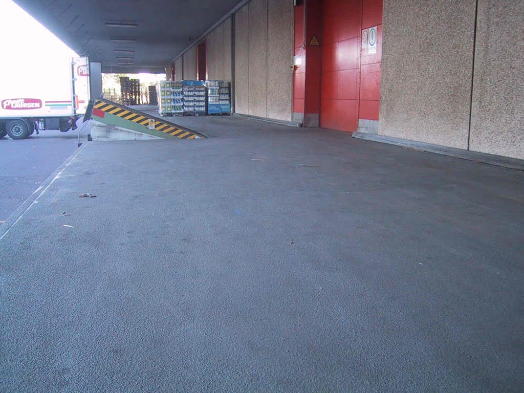 Denne kombination sikrer et støvresistent, kemikaliebestandigt og skridsikkert gulv, velegnet til læsseramper og andre industriområder med tung daglig trafik.