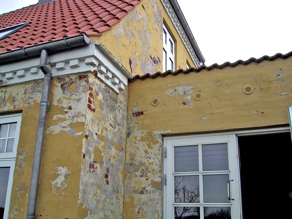 Før renoveringsarbejdet kunne begynde, blev pudsens tilstand nøje vurderet. Den eksisterende puds var mange steder begyndt at skalle af og vise tegn på revner og fugtskader. En grundig forberedelse var derfor nødvendig for at sikre, at det nye pudslag kunne hæfte ordentligt og give et holdbart resultat.