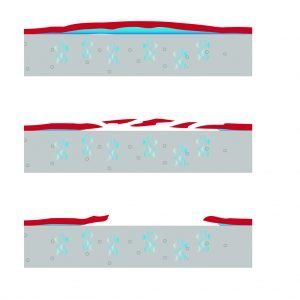Når presset overstiger malingens vedhæftning – som ofte er meget dårlig til fugtig beton – skubbes malingen løs fra underlaget nedefra. Når først malingen har sluppet underlaget vil selv almindelig gangtrafik hurtigt knuse malingen til flager, så der efterlades et åbent sår, der med tiden bliver til mere udbredte skader.